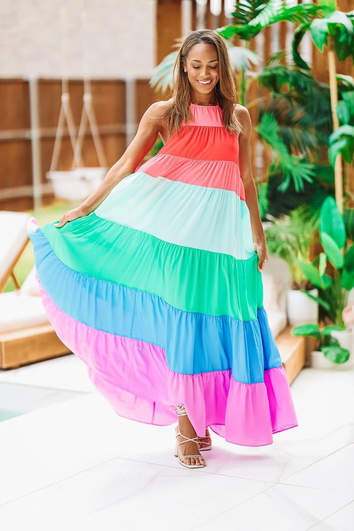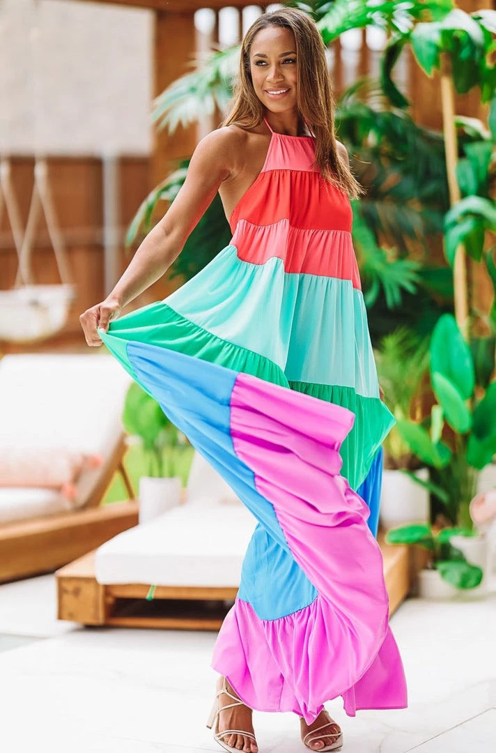 Color us happy in this colorful summer maxi dress! ย This dress features a halter neck, tons of flow, elastic band in the back and all the most beautiful colors combined for the most perfect maxi dress. We can’t get enough of this and it’s an H&O favorite. Plan the vacation around this dress!ย