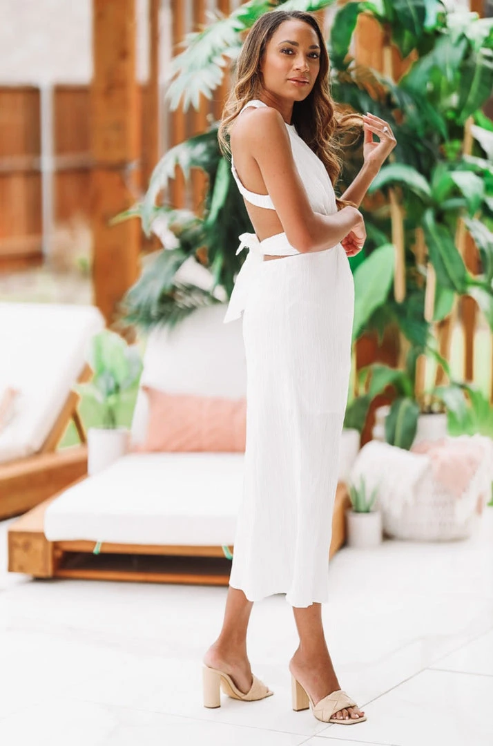 Destination vacation coming up? The sand, the ocean, the sunset and this dress is all you need. Â We’re obsessed. An off-white long sundress with side and back cut outs, a back tie, zipper on the lower back and elastic straps and waist. Â This women’s boutique dress in off-white is on trend and packing itself in your suitcase. Vacation dress of the season right here!