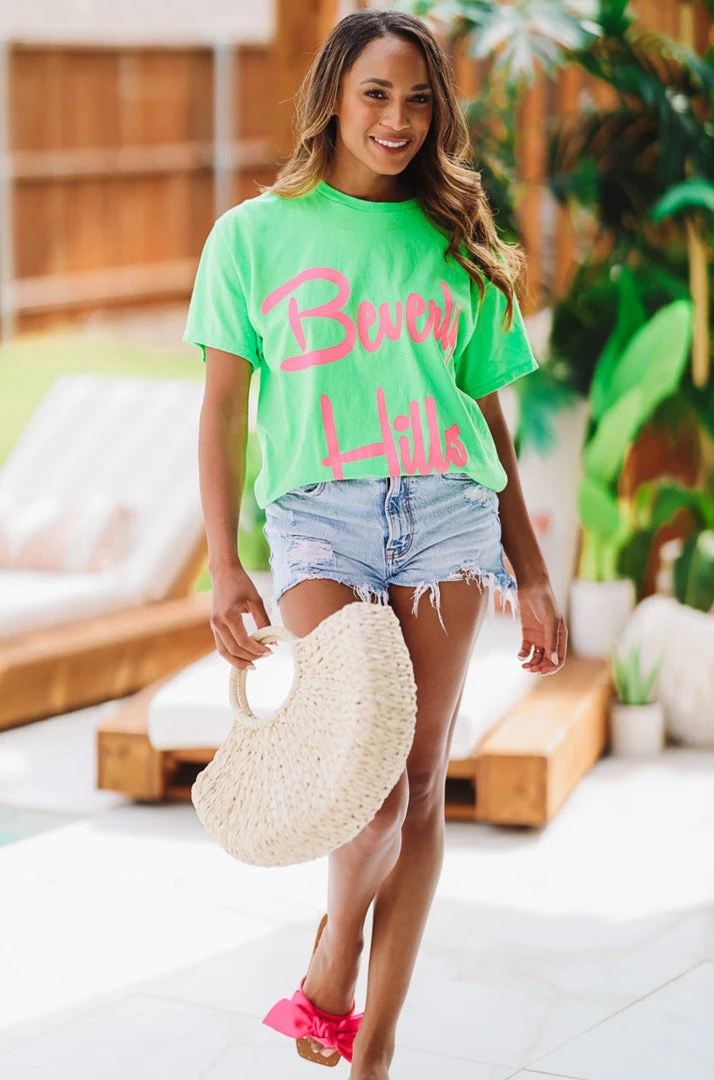 90210 is the zip code! Our neon green oversized tee with neon letters is 100% cotton and 100% already in your cart! Â We LOVE this for summer with cut-off shorts and cute sandals. Find Brandon and Dylan and let’s got to the beach club!Â