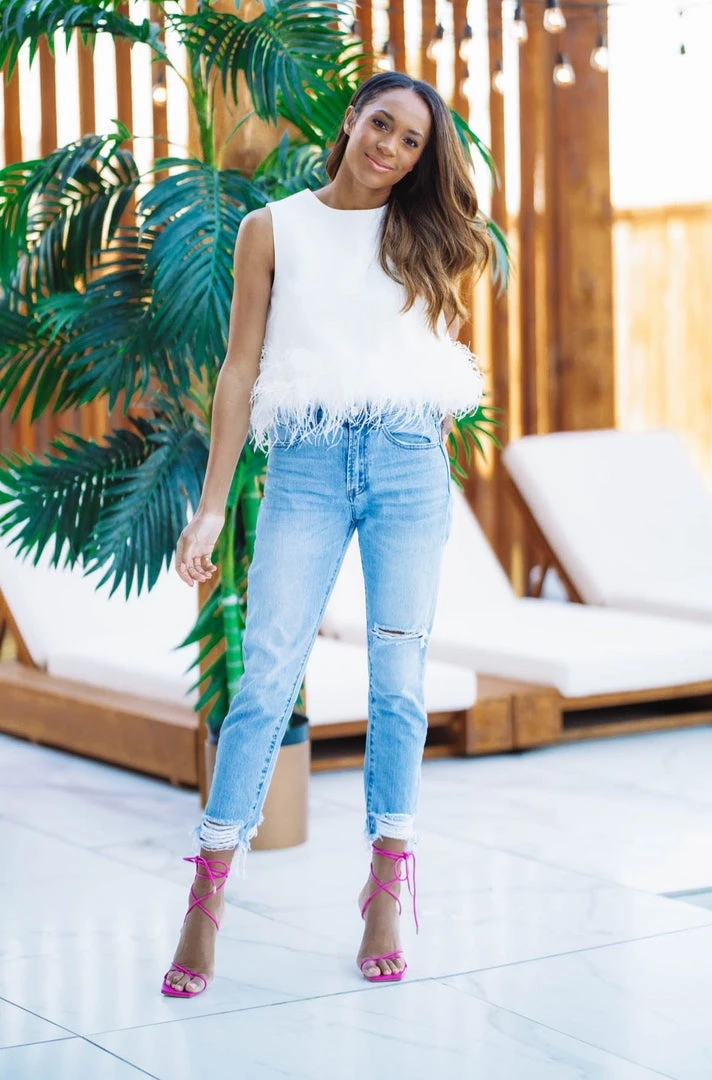 We are dying over this feather trend and this gal in THIS top. A sleeveless top, crop style hitting just above the waistline that is trimmed in feathers and a scoop neck. Could you really need anything more? It’s fun, flirty, sassy and sultry all in one. Get on trend now with the feathered look. We think it should stick around for a while! They’re just fun. Pair this with jeans or dress it up even more with black vegan leather leggings and your favorite stilettos. Date night ready! (please note real feathers on this top sometimes show a light color variations). P