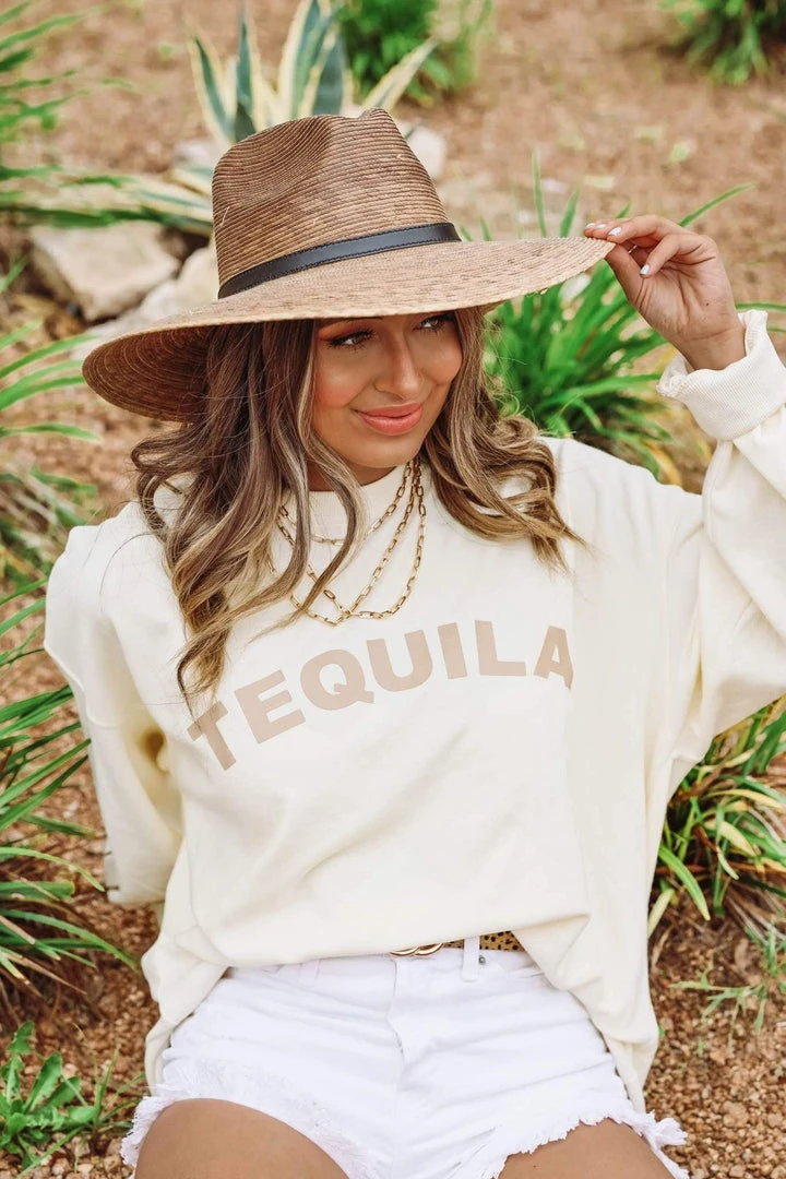 It’s TEQUILA time baby! This adorable pullover was designed in-house by our Hazel and Olive label design team, and is the perfect party pullover! This pullover has a super soft ribbed corded fabric, rounded neckline, oversized fit, and a beige “Tequila” printed on the front. This sweatshirt is perfect for all of our tequila lovers!
