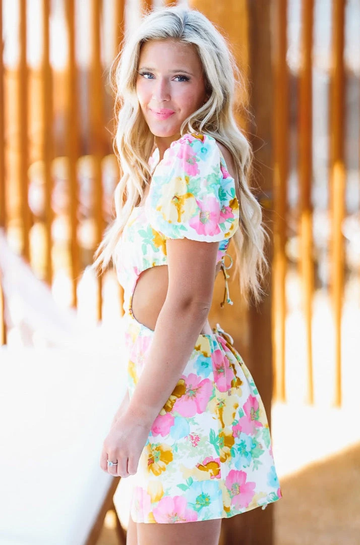New in Town or just looking all new in this dress? This women’s spring dress features a gorgeous floral pattern in just the right colors, cut outs on each side, an open back and a sheath dress style. We love this ever so much for Sunday brunch, showers, and make this a vacation dress, too!Â