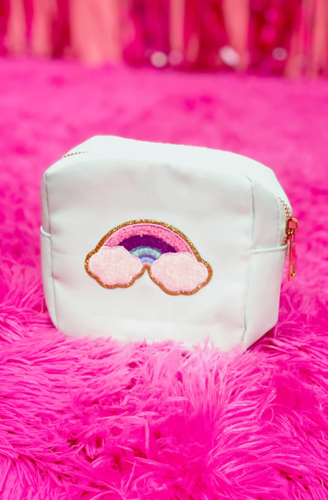 Cutest little bag for all the fun stuff adorned with a pastel rainbow patch! This bag fits hair ties, lip gloss, feminine products or your make up essentials needed to freshen up!
